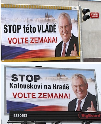 V Otázkách Václava Moravce, které 13. ledna odvysílala Česká televize, se Miloš Zeman nechal slyšet, že pro něj je tato částka zbytečně mnoho. S tím, že „jeho dvě brady se na billboardech zrovna dobře nevyjímají“, vyloučil outdoorovou kampaň a rozhodl se soustředit především na televizní debaty. Billboardy s novým motivem však Zeman více než týden před rozhodující volbou nakonec vylepil. Sází v nich na podobnou kartu, kterou používá v televizních debatách, kdy spojuje svého protikandidáta se současnou vládou a s ministrem financí Miroslavem Kalouskem.