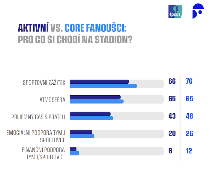 Na stadion chodí fanoušci nejvíce za sportovním zážitkem, atmosférou, ale také zde rádi tráví příjemný čas s přáteli. Každý pátý aktivní fanoušek a každý čtvrtý core fanoušek to vnímá jako emocionální podporu týmu či sportovce.