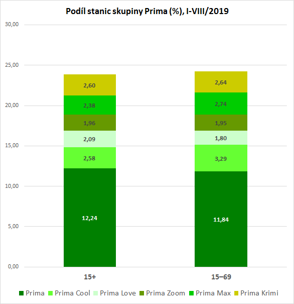 Podíl tematických stanic skupiny Prima tvoří na celkovém výsledku televizní skupiny přibližně polovinu. Na grafu níže je možné vidět přínos jednotlivých stanic k celkovému výsledku za letošní období leden až srpen 2019 v celodenním vysílání v diváckých skupinách 15+ a 15-69.