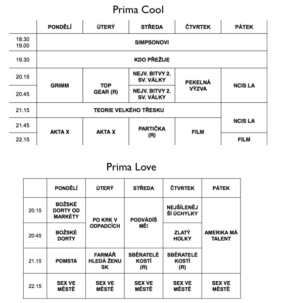 Programové schéma Prima Cool a Prima Love, jaro 2013