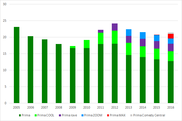 Portfolio skupiny se zároveň podstatně rozšířilo. Zatímco v roce 2005 disponovala jedním kanálem (Prima), v současnosti provozuje pět stanic v režimu bezplatného vysílání, podílí se na provozování zábavního kanálu Prima Comedy Central a pustila se také do placených služeb (spuštění stanic Prima +1 a na Slovensku Prima Plus). Svůj záběr rozšířila na internetu a také v segmentu tištěných titulů. Celkový podíl skupiny na televizním trhu z pohledu sledovanosti se ale vcelku příliš neměnil. Vývoj lze rozdělit do dvou částí: po roce 2005 přichází oslabení programu a pokles podílu sledovanosti na necelých 17 % v roce 2009. Mezitím už ale Prima vystřídala generálního ředitele, kdy Litevce Aleksandra Cesnaviciuse nahradil Marek Singer (nástup od února 2008). Po jeho příchodu se televize zvedá, s nástupem digitálního vysílání připravuje nové kanály (první je v roce 2008 Prima Cool, následují Prima Love v roce 2011, Prima Zoom v roce 2013 a Prima Max a Prima Comedy Central v roce 2015). Podíl se postupně zvyšuje až přes 24 % v roce 2012, což je zatím nejlepší celoroční výsledek skupiny.