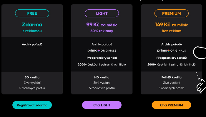 Službu bude možné sledovat zdarma s reklamou (v zásadě jde o stávající nabídku iPrima.cz), v nabídce bude ale jen omezený počet titulů. V případě, že uživatel zaplatí 99 Kč měsíčně a bude ochotný sledovat pořady s polovičním množstvím reklamy, bude mít k dispozici nabídku více než 2000 českých i zahraničních titulů, produkci Prima+ Originals i předpremiéry a archiv. Sledovat je bude možné v HD kvalitě. Za měsíční cenu 149 Kč měsíčně pak získá přístup ke kompletní nabídce včetně Prima+ Originals, předpremiér i archivu, a to bez reklam a v kvalitě full HD.