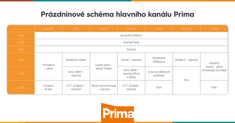 TV Prima zařadí do letního vysílání několik premiérových seriálů a filmů. Vedle toho nasadí reprízy svých původních pořadů.