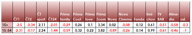 Po prezidentských volbách se v únoru snížil podíl ČT24 a ČT1, což se odrazilo na nižším únorovém podílu stanic České televize ve skupině 15+ (-2,74).