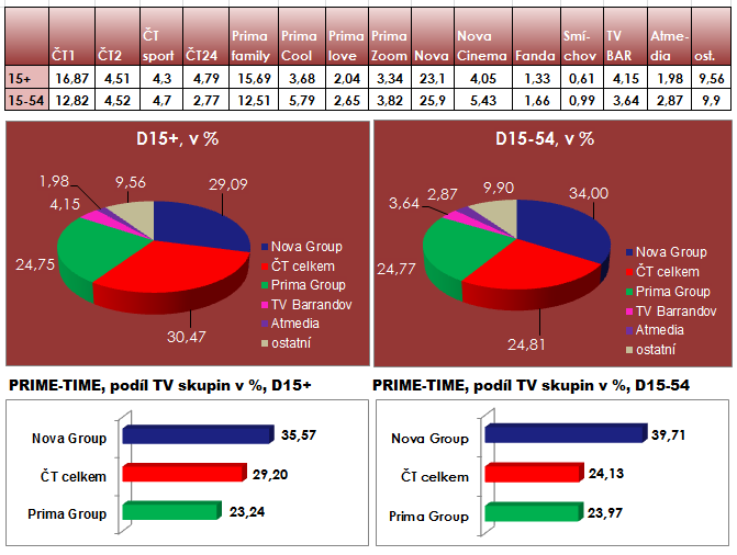 Skupina Nova si v širší skupině v únoru polepšila o 0,67 procentního bodu, v mladší 15-54, na kterou prodává reklamu, dosáhla obdobného výsledku jako v lednu (-0,02). Podíl TV Barrandov a stanic Atmedia se snížil o 0,5, resp. 0,6 procentního bodu. Do výsledku skupiny Nova se promítlo také zařazení nového kanálu Smíchov do elektronického měření. Únorový podíl komediálního kanálu představoval 0,99 % ve skupině 15-54 a 0,61 v šrší skupině 15+.