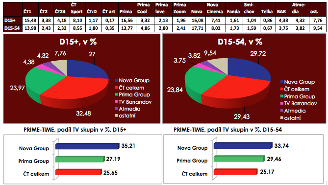V celodenním podílu 15+ se Prima v neděli dostala těsně na pozici nejsilnější televize (16,56 %). V hlavním vysílacím čase si skupina Prima ve srovnání s minulou nedělí polepšila o 9 procentních bodů (15+).