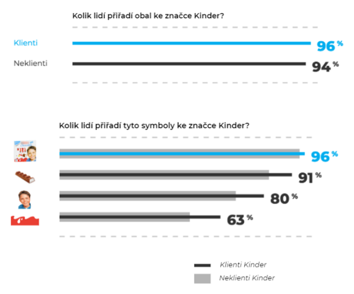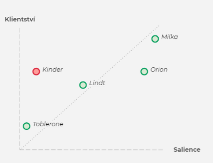 Salience (neboli to, že si značku vybavíme v nákupní situaci) silně koreluje s reálným nákupním chováním lidí – jak u Milky, tak u Orionu. Značku Kinder si ale samo od sebe vybaví jen 5 % lidí. Což není moc. Reálně si ji ale pak koupí 43 % zákazníků, stejně jako Orion. A to už vůbec není špatné.