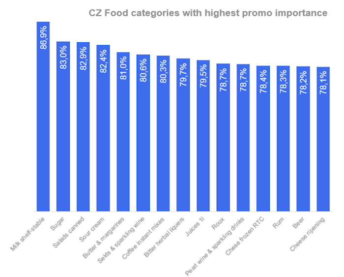 Existují kategorie, kde je podíl zboží prodaného v rámci akcí dokonce vyšší než 80 %, příkladem mohou být kategorie jako trvanlivé mléko, cukr nebo máslo a margaríny. V praxi to znamená, že tyto kategorie se již téměř nenakupují za běžnou cenu. To naznačuje, že spotřebitelé již mohou vnímat akční ceny jako ty standardní a již příliš neuvažují nákup těchto výrobků za plnou cenu.