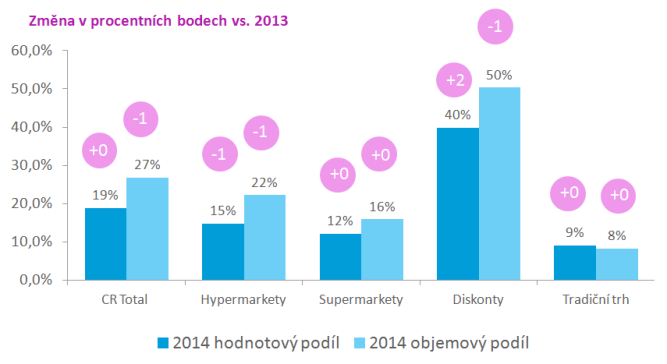 Průměrný podíl privátních značek na trhu se dlouhodobě drží na 19 %. Důvodem proto je silný promoční vliv značkového zboží, například v loňském roce se v promocích prodalo 53,8 % potravin a 45,6 % drogistických výrobků. Vyplývá to z průzkumu agentury Nielsen, který byl ve středu prezentován na Retail Summitu.