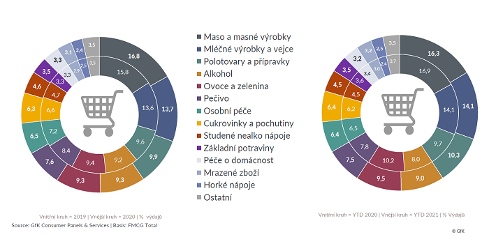 V roce 2020 realizovala každá tuzemská domácnost v obchodech v meziročním srovnání o 16 nákupů méně, což je nejdynamičtější pokles nákupní frekvence v posledních letech. Na druhou stranu výrazně vzrostla velikost nákupního košíku. „Po uplynulém dynamicky se vyvíjejícím roce 2020, kdy se spotřeba do velké míry přesouvala do našich domácností, došlo v úvodu roku 2021 k jisté stabilizaci. I nadále však zůstává domácí konzumace zboží a služeb na zvýšené úrovni,“ nastínil Ladislav Csengeri z GfK.