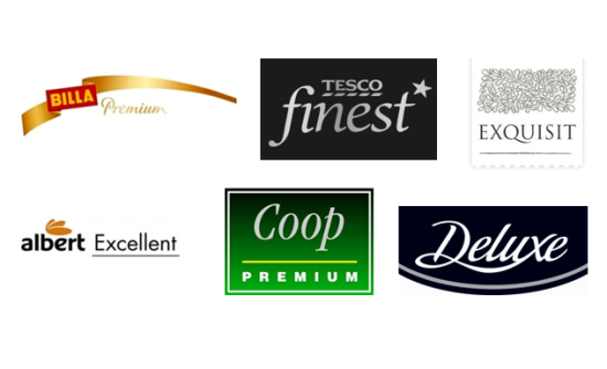 Na prémiové privátní značky sází například Tesco se svým Tesco Finest, Albert s řadou Albert Excellent, Coop s Coop Premium, Billa s Billa Premium či Lidl se značkou Deluxe a Kaufland se značkou Exquisit, které jsou však do nabídky zařazeny jen v určitých obdobích roku, zejména u příležitostí vánočních či velikonočních svátků.