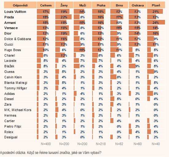 Tématem aktuálního výzkumu je především přístup českých spotřebitelů k autorské módě. Autorská móda je pro Čechy především symbolem originality nebo jedinečnosti, spojují si ji rovněž s vysokou cenou. V průměru respondenti očekávají, že autorská móda stojí dvojnásobek toho, co jsou ochotni vydat za určitý kus oblečení. Zatímco u košile jsou ochotni dát v průměru kolem 1 400 korun, u autorské košile očekávají cenu o tisíc více. Značky autorské módy ale Češi většinou nepovažují za luxus. Luxusní značky pro ně představují Louis Vuitton, Prada, Armani, Versace a Dior. Pro 38 % Čechů dokážou luxusní značky snadněji vyjádřit společenské postavení než autorská móda, jen 35 % je opačného názoru.