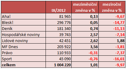 Průměrné prodané náklady tuzemských deníků v letošním září souhrnně přesáhly hranici jednoho milionu výtisků. Oproti letošnímu srpnu, kdy se celkový prodej deníků dostal na svoji nejnižší úroveň, se tak prodej deníků v devátém letošním měsíci vylepšil, a to v průměru o 1 %. Oproti srpnu si polepšily téměř všechny deníky. Ve srovnání s loňským zářím vykazuje průměrný prodej českých deníků 10% pokles. Jediným deníkem, jehož prodané náklady meziročně neklesly, jsou Lidové noviny.