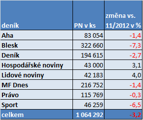 Souhrnný prodaný náklad tuzemských deníků v loňském prosinci dosáhl 1,064 mil. výtisků, což bylo o 3 % méně než v listopadu. Prosinec je tradičně kvůli vánočním svátkům prodejně slabším měsícem. Přesto se ale v loňském prosinci v souvislosti s úmrtím Václava Havla prodej deníků nesnižoval tak výrazně jako o rok dříve. Tehdy bylo snížení mezi listopadem a prosincem o více než 6 %. Některé celostátní deníky si v loňském prosinci dokonce oproti listopadu téhož roku polepšily: platí to zejména o Lidových novinách (+4 %) a Hospodářských novinách (+3 %).