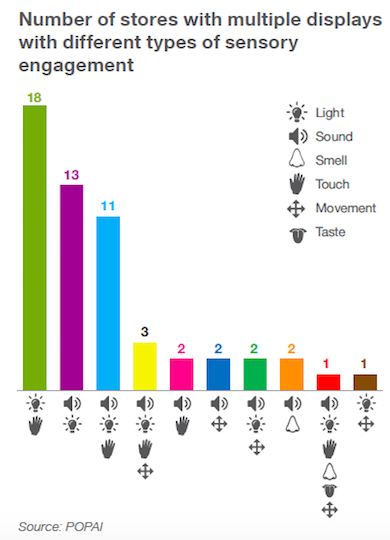 Prostředky senzorického marketingu byly zaznamenány v 70 % obchodů, které nejvíce pracovaly se zvukem (51 %) a se světlem (40 %). Hmatové vjemy nabízelo 26 % prodejen, pohyb ke komunikaci využilo 11 %. Jen čtyři prodejny si pohrály i s vůní a dvě se pokusily oslovit dokonce i chutě zákazníků. Pokud senzorické prostředky kombinují, nejčastěji se tak děje u propojení strategické práce se světlem a hmatovým vjemem.