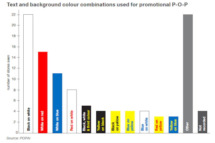 Mezi nejoblíbenější barvy ve sledovaných prodejnách patřily: bílá, černá, červená, modrá a žlutá. Celkem se v nich nacházelo 39 různých kombinací textů s barevným pozadím, nejčastěji černé písmo na bílé, bílé na červené či modré.