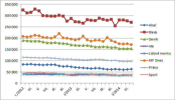 Nejprodávanějším deníkem zůstává bulvární Blesk s průměrným prodaným nákladem v dubnu 270 tis. kusů. Ve srovnání s loňským dubnem si Blesk dokonce mírně polepšil, především díky elektronickým verzím. Blesku navíc meziročně klesá pultový prodej novin nejméně ze všech tuzemských deníků.