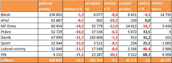 Druhý nejprodávanější deník MF Dnes v dubnu prodej meziročně snížil o téměř 40 tis. výtisků. Protože síť regionálních deníků Deník ztrácela v meziročním srovnání méně, představoval v dubnu rozdíl mezi oběma deníky už jen cca 17 tisíc výtisků.