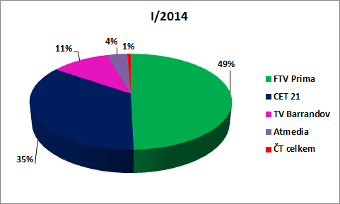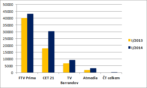 Celkový počet prodaných reklamních TRP (target rating points) v letošním lednu je přibližně o 30 % vyšší než ve stejném loňském období. Objem prodané reklamy byl tak v letošním prvním měsíci podstatněji vyšší než na začátku loňského roku. Jak vyplývá z grafického znázornění níže, objem prodaných TRPs v letošním lednu mírně překonal i lednový objem roku 2012. Nárůst je patrný u všech televizních skupin, nejvýrazněji pak u televizní skupiny Nova, která loňský rok odvysílala méně reklamy než obvykle kvůli dlouhým vyjednáváním s inzerenty a s mediálními agenturami. Nejvyšší podíl na počtu prodaných TRPs si však stále udržuje televizní skupina Prima.