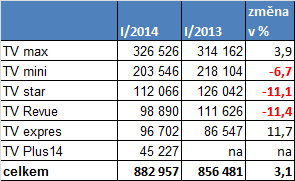 Dva nové programové čtrnáctideníky ale zatím nevedly k oslabení pozic stávajících titulů. Nejprodávanější televizní čtrnáctideník TV max (Bauer Media), který v reakci na příchod nových titulů snížil prodejní cenu ze 14 Kč na 12,90 Kč, si v lednu v meziročním srovnání dokonce polepšil o 4 %. Také TV Expres (Astrosat) zaznamenal letos v lednu lepší výsledky než před rokem. Do segmentu programových čtrnáctideníků nově přibyl také dřívější týdeník TV Plus, který se transformoval na TV Plus 14 (Bauer Media).