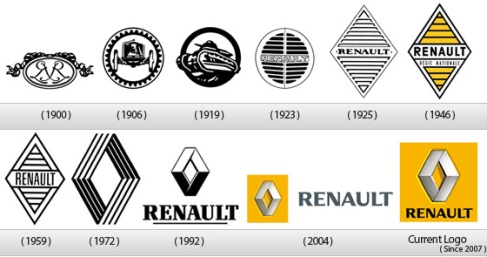 Renault, poslední z francouzských automobilek, svůj pověstný kosočtverec používá od roku 1925. Před tím na přelomu století měl zcela jiné logo, které sestávalo z iniciál tří bratrů Renaultů: Louise, Ferdinanda a Marcela. V roce 1906 se dostal do loga tehdejší stěžejní výrobek – ozubená kola –, který v roce 1919 vystřídal v souladu s dobou tank. Roku 1923 je tank vyměněn za mřížku a do loga se poprvé dostává název společnosti Renault. O dva roky později dostává logo svou současnou podobu diamantu, který má symbolizovat vysoce kvalitní značku. Po 2. světové válce je automobilka znárodněna, což se mimo jiné projeví i v logu přidáním nápisu Régie Nationale (Národní správa), který je vypuštěn až v roce 1959. V roce 1972 se logo modernizuje, když mu designér Victor Vaserely dodává třetí rozměr. Současné logo se používá od roku 2004, kdy je diamant dán na žluté pozadí, což má ještě více podtrhovat kvalitu.