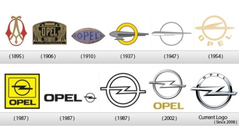 Opel patří k automobilkám s dlouhou tradicí. Původně společnost na výrobu šicích strojů a jízdních kol měla ve svém logu iniciály svého zakladatele Adama Opela. Nedlouho po jeho smrti v roce 1985 se společnost po akvizici Lutzmannovy společnosti proměnila v automobilový závod. V roce 1906 se logo mění pod vlivem secesní atmosféry a o čtyři roky později dochází k další proměně, kdy logo dostává tvar oka, které obepíná vavřínový věnec. Od roku 1935 logo dostává kruhový tvar, kterým prolítává stylizovaná vzducholoď, symbolizující pokrok a inovativní přístup. V roce 1964 se začíná místo vzducholodě používat symbol blesku, který je ohraničen obdélníkem na žlutém pozadí. Poté již došlo jen k menším změnám: podoba blesku byla mírně upravena a logo následovalo současný 3D trend.