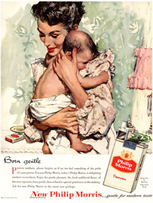 Současná společnost kouřící kojící matky většinou odsuzuje. Ne však tato reklama značky Philip Morris z roku 1956, která pro jemnost svých cigaret kouření hrdým matkám dokonce doporučuje. Studie pojednávající o škodlivosti kouření na zdravotní stav byla uveřejněna šest let před touto reklamou.
