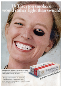 Poněkud rozporuplně působí reklamní kampaň cigaret Tareyton. Původní záměr tvůrců znázornit ochotu kuřáků cigaret Tareyton snášet i rány a následné monokly od kuřáků jiných značek má přeci jen nepatrně smrtelný tón.