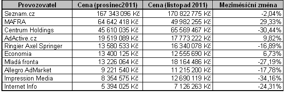 Tabulka níže uvádí TOP 10 provozovatelů (skupina médií nebo mediazastupitel), jejichž reklamní prostor zadavatelé využívali. V rámci této skupiny se v prosinci vystavila online inzerce v ceníkové hodnotě 360 milionů korun. Oproti předchozímu měsíci tito provozovatelé zaznamenali pokles o 5,74 %.