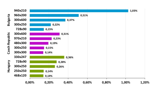 Nejvyšší míry CTR dosáhl na všech analyzovaných trzích kromě České republiky formát Pre-roll (tento reklamní formát nebyl na českém trhu měřen zvlášť). Tento formát je velmi populární například v Polsku, kde je druhým nejpoužívanějším reklamním formátem. Zajímavé je, že v Bulharsku má tento formát stále nízký podíl na reklamním trhu, a to i přesto, že generuje nejvyšší počet kliknutí. Mezi nejefektivnější reklamní formáty na zkoumaných trzích patří také Video, Wallpaper a Toplayer. Nejvyšší míru CTR vykazuje v Česku formát 300x600.