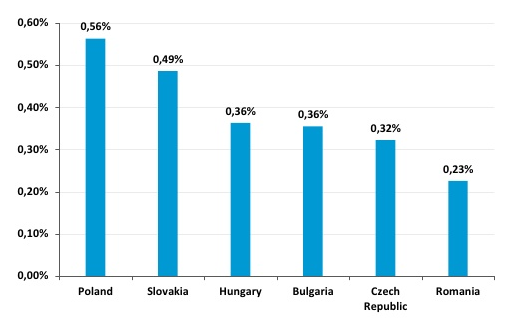 Zatímco v první polovině roku 2011 mělo nejvyšší průměrné CTR Slovensko, nyní je to Polsko. Míra prokliku zde dosáhla téměř 0,6%, což znamená nárůst o 10 procentních bodů. Výrazný nárůst průměrného CTR (11 procentních bodů) byl zaznamenán také v Maďarsku, které má třetí nejvyšší míru prokliku. Poslední pozice v žebříčku patří Rumunsku, ve kterém je CTR téměř třikrát nižší v Polsku.