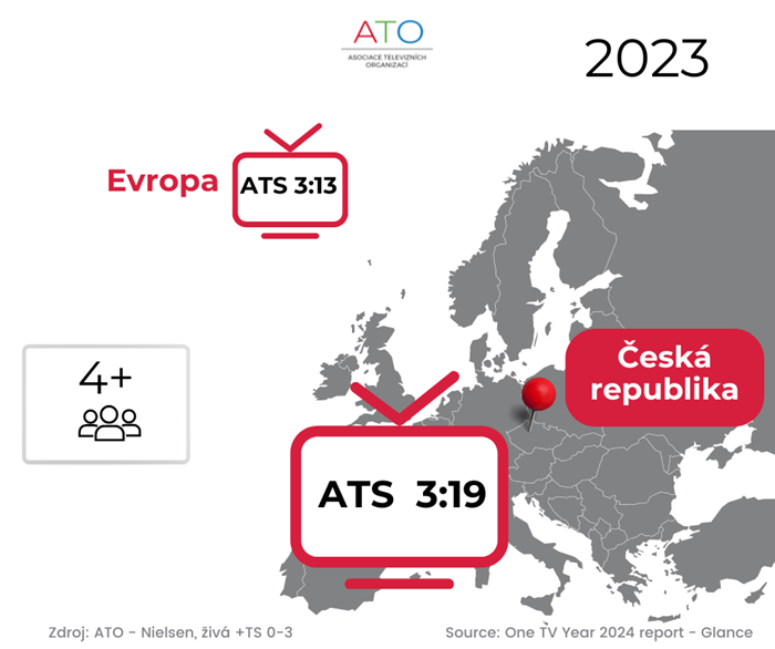 Sledovanost televize v Česku v roce 2023 dosáhla v cílové skupině osob 4+ průměrné denní hodnoty 3 hodiny a 19 minut. Tím překonává evropský průměr, který činí 3 hodiny a 13 minut, jak je uvedeno v ročence Glance One TV Year in The World za rok 2023. Při příležitosti Dne peoplemetrů, který připadá na 2. června, to oznámila tuzemská Asociace televizních organizací (ATO).