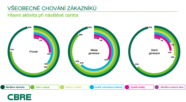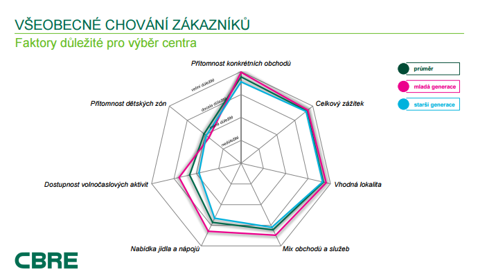 Rozhodování, kam „zajet na nákupy“, dále ovlivňuje pohodlí, možnosti parkování či internetového připojení. Preference se přitom nemálo liší podle věku; zatímco starší spotřebitelé volí raději menší obchodní centra, v nichž se snadno orientují, mladí častěji zavítají do center větších, kam zdaleka nechodí jen nakupovat, ale berou je i jako místo setkávání s přáteli. Až 88 % mladých návštěvníků ocení nabídku restaurací a kaváren a 65 % z nich využije možností zábavy, kterou nabízí kina, bowling, laser game nebo další volnočasové aktivity. Vyplývá to z výzkumu společnosti CBRE.