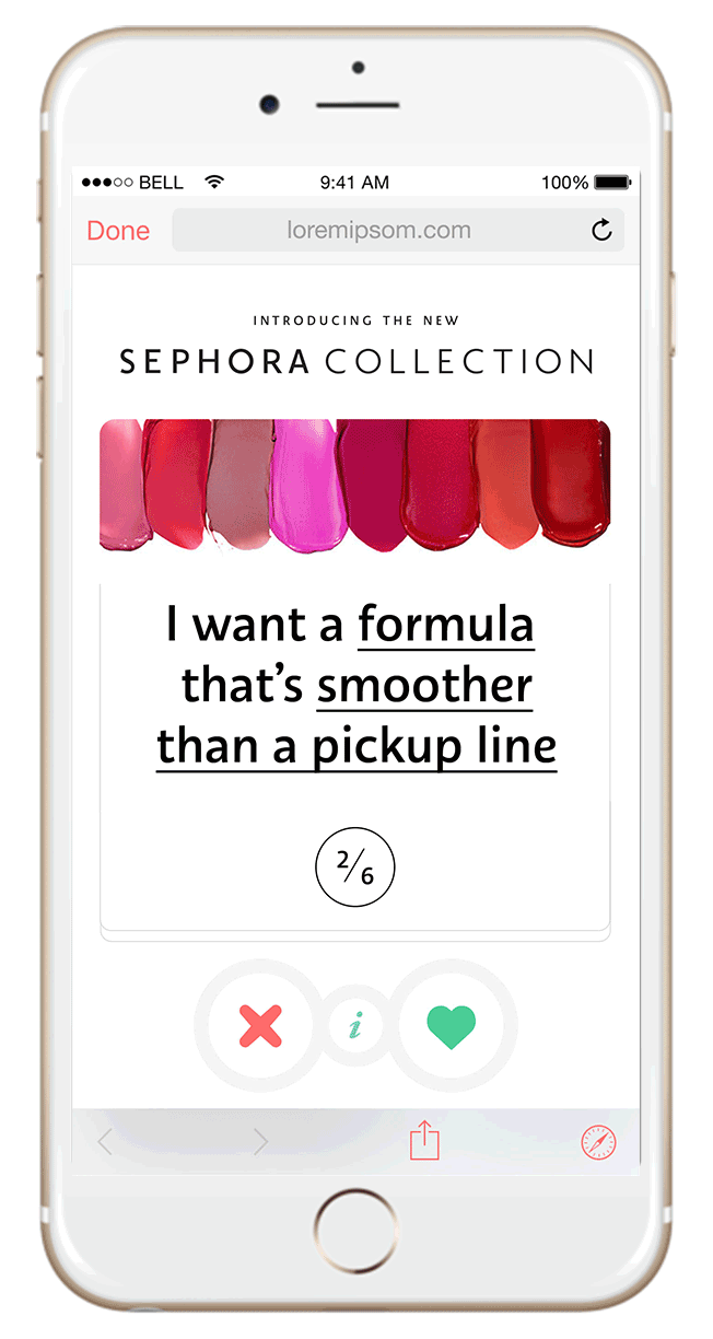 „Snažíme se tak vytvořit zábavné a návykové zákaznické zkušenosti,“ popisuje Deborah Yehová, viceprezidentka pro marketing a značku Sephora. Do budoucna počítá firma i s obsahem vytvořeným uživateli. Webovou prezentaci přitom doplňují reklamy na Tinderu. „Původně jsme o reklamách na Tinderu neuvažovali. Brali jsme ho jen jako zdroj inspirace, ale čím dál víc jsme o tom mluvili, tím více nám Tinder připadal jako potenciální propagační nástroj,“ dodává Yehová.