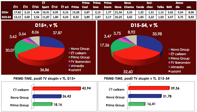 V širší divácké skupině 15+ získal první kanál České televize opět nejvyšší pozornost televizních diváků s pátečními večerními pořady První republika, Všechnopárty a 13. komnata. Závěrečný díl seriálu První republika zhlédlo v průměru 1,2 mil. diváků nad 15 let. Stal se nejúspěšnějším pořadem pátečního večera.