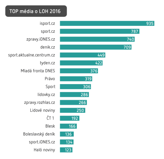 Olympijské hry podle očekávání vzbudily velkou mediální pozornost. Média i veřejnost na sociálních sítích se soustředily především na českou reprezentaci a její výsledky. Zájem o jednotlivé sporty se střídal podle toho, kdy probíhaly, a publicita rostla s účastí a případně s úspěchy českých sportovců a sportovkyň. Největší medializace dosáhly Letní olympijské hry 2016 (LOH 2016) v českých klasických i sociálních médiích po zisku zlaté medaile v judu a během rozhodujících zápasů semifinále tenisového turnaje 11. a 12. srpna. Vyplývá to z analýzy společnosti Newton Media.