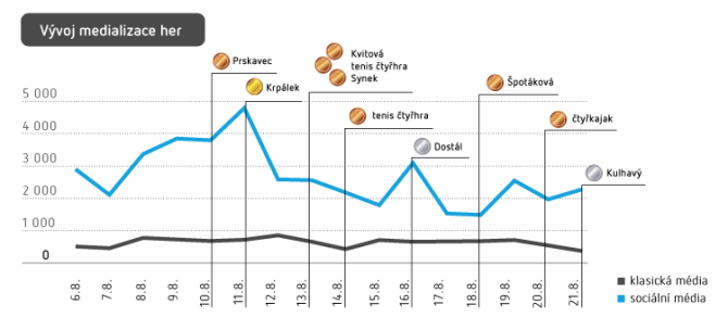 Klasická média svou pozornost mezi sporty i medailisty rozložila rovnoměrněji než sociální sítě. Nejvíce informovala o tenise a Barboře Strýcové. Publicitu, kterou zajistil bronz českým tenistkám, však zdaleka nepřinesl všem sportovcům se stejně cenným kovem. Například posádka čtyřkajaku se přes bronzový úspěch velké pozornosti všech médií netěšila. A dokonce ani dvě medaile pro Josefa Dostála zájem klasických médií o český tenis nepřekonaly.