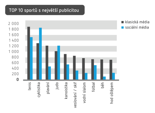 Nejprobíranějšími sporty byly tenis a cyklistika, jejich pořadí na prvních dvou příčkách však bylo v klasických a sociálních médiích přesně opačné. Tenis ovládl klasická média, zatímco na sociálních sítích byla nejdiskutovanější cyklistika (zejména díky diskusím o startu Martiny Sáblíkové). Překvapivě malý zájem mezi diskutujícími na sociálních sítích vzbudil běh (okolo 100 komentářů), a to i přesto, že novináři o něm informovali ve více jak 700 příspěvcích.