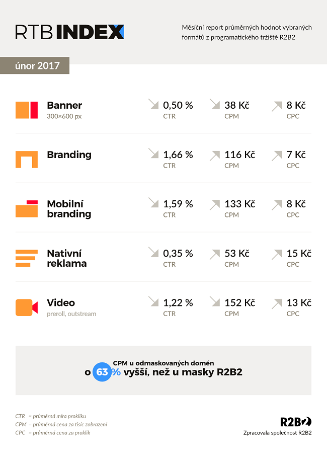 RTB Index zveřejňuje ceny u vybraných formátů: banner 300x600, branding, mobilní branding, nativní reklama a video (preroll, outsream). Vzájemné srovnání těchto formátů ukazuje, že CPC (průměrná cena za proklik) je nejnižší v případě brandingu (7 Kč) a naopak nejvyšší u nativní reklamy (15 Kč) a videa (13 Kč). Nejvyšší míra prokliku (CTR) je pak u brandingu, který se řadí mezi nejlépe viditelné formáty, a mobilního brandingu.