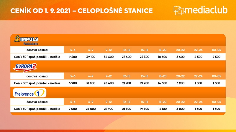 Mediální zastupitelství Media Club zdraží od 1. září 2021 ceny ve svých rádiích o 12 %. K navýšení cen přistupuje po čtrnácti letech. Zvýšení neplatí pro sponzoring, eventy, soutěže ani speciální operace. Ceny reklamních spotů pak zůstávají stejné u Frekvence 1 a z regionálních rádií u rádia Signál. Rovněž klienti, kteří mají s Media Clubem uzavřené dlouhodobé smlouvy, mají do konce roku zajištěny stávající podmínky. Zdražení se tak od září dotkne nových klientů a klientů, kteří využívají rádiovou reklamu na krátkodobou spolupráci. „Cenovou politiku jsme analyzovali do hloubky a konzultovali s některými klienty. Změny na trhu, které mimo jiné vyvolaly zvýšený zájem o rozhlasovou reklamu, nás utvrdily o správnosti rozhodnutí,“ přibližuje obchodní ředitel rádiové divize Media Clubu Jan Čadek.