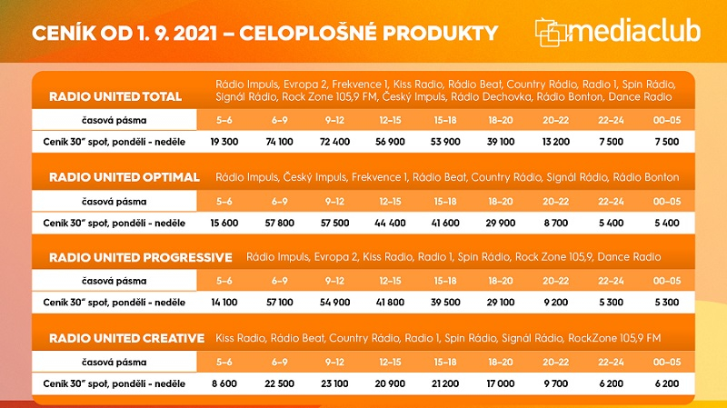 Media Club zastupuje při prodeji reklamy celoplošné stanice Impuls, Evropa 2, Frekvence 1 a dále nadregionální a regionální stanice Kiss, Beat, Country, Signál, RockZone 105.9, Radio 1, Radio Bonton, Spin, Dechovka, Dance a Český Impuls. Hlavním produktem je Media Club Total, který obsahuje všechna zmíněná rádia a týdně osloví 4,6 mil. posluchačů. V nabídce jsou také balíčky Radio United Optimal, zaměřující se na oslovení rodin s aktivním životním stylem, Radio United Progressive, mířící na mladší posluchače, a Radio United Creative pro nestandardní operace. Media Club je nesilnějším hráčem na trhu rozhlasové reklamy s podílem na poslechovosti 40,3 % (zdroj: Radioprojekt, 4Q/2020+1Q/2021, SKMO, Median, Stem/Mark, Nielsen Admosphere).