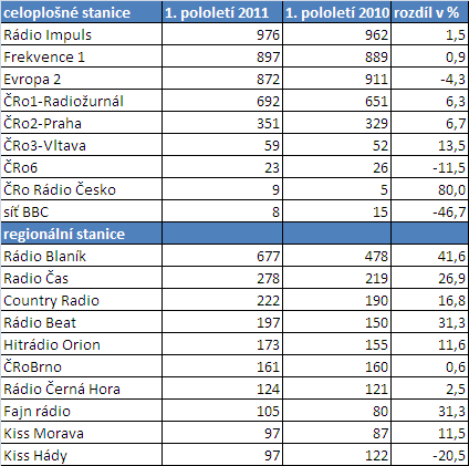 Zdroj: Radio projekt, 1.1.-30.6. 2011, STEM/MARK, Median, SKMO