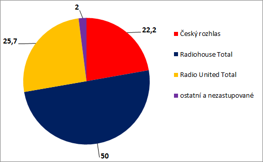 Nejsilnější rozhlasovou sítí je Radiohouse s 50 %, mírně si polepšila síť Radio United na 25,7 %. Stanicím Českého rozhlasu náleží podíl ve výši 22,2 %.