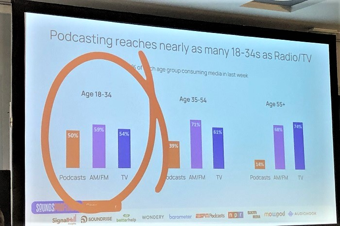 Tom Webster, partner společnosti Sounds Profitable, nabídl srovnání mezi uživateli podcastů, televizními diváky a posluchači rádií. Počet posluchačů podcastů roste a toto publikum lze popsat jako mladší. Publikum ve věku 18-34 let používá podle výzkumu podcasty, televizi a rádio téměř stejně, zatímco lidé středního věku většinou používají rádio (35-54) a starší publikum (55+) více sleduje televizi.