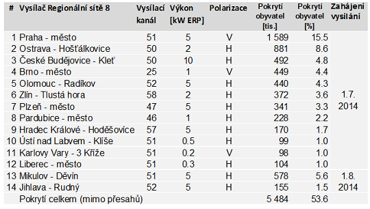 České Radiokomunikace (ČRa) dokončily výstavbu Regionální sítě 8 a od 1. července bude zahájen její oficiální provoz. Prvními vysílateli jsou stanice Noe TV a Sport 5. Celkové pokrytí multiplexu 8 poskytne signál pro 54 % obyvatel České republiky, zejména v oblasti krajských měst. Signálem pokrývá všechna krajská města a přilehlá okolí.
