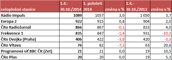 Ve srovnání s výsledky za první pololetí letošního roku jsou výsledky celoplošných stanic stabilní. Mírně klesly stanice ČRo Dvojka a ČRo Vltava, velmi mírně pak i Frekvence 1. Naopak svou pozici upevnilo Rádio Impuls a své postavení potvrdila i Evropa 2. Všechny změny jsou ale v rámci statistické chyby.