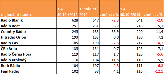 Mezi regionálními rádii má stále velký náskok Rádio Blaník, nejlépe se ale ve sledovaném období vedlo Country Rádiu, které si ve srovnání s minulým obdobím polepšilo o 34 %.