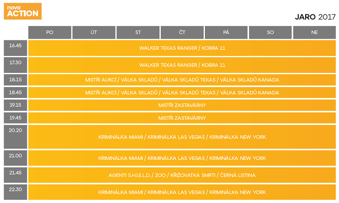 Nova Action vychází z mužského kanálu Fanda. Na jaře přinese např. seriály Walker Texas Ranger, Kobra 11, CSI Miami, Las Vegas a New York. Novinkou má být seriál Zoo nebo akční Křižovatka smrti. Vizuálně staví na akci, hlavní barva je žlutá.
