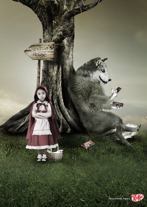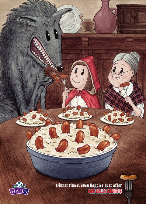 Oblíbeným motivem je pohádkové příběhy přeměnit. Například v britské reklamě od agentury Denvir Marketing na párky Wee Willie Winkie’s spolu k večeři zasedla Červená karkulka spolu s vlkem či Jeníček a Mařenka s ježibabou.