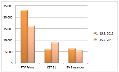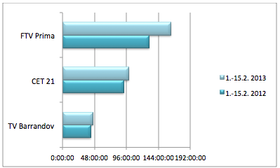 Ve srovnání s loňským obdobím od 1.-15. února se ve stejných letošních dnech zvýšil čas reklamního vysílání skupiny Prima o více jak 32 hodin. TV Barrandov letos v první polovině února věnovala reklamnímu vysílání o tři hodiny déle než ve stejném období loni. Přestože souhrnný čas věnovaný reklamnímu vysílání je meziročně mírně vyšší také na kanálech CET 21, je to dáno zejména zapojením nových kanálů do obchodování. Průměrný čas, který reklamnímu vysílání v polovině února věnoval hlavní kanál TV Nova, byl v důsledku nové obchodní politiky meziročně nižší o více než 10 hodin.